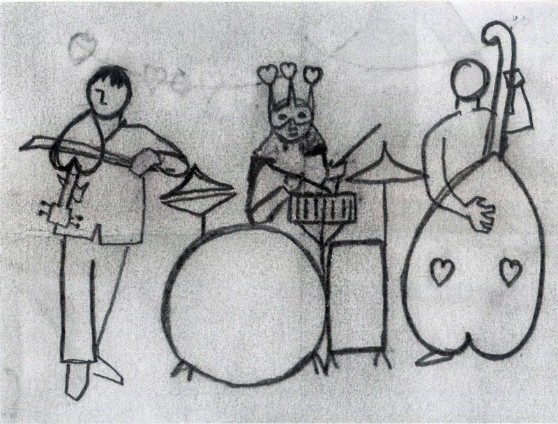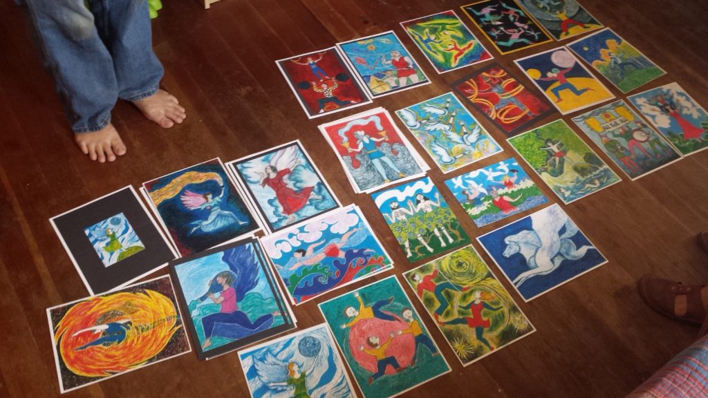 Over the last 30 years, Joe worked on his art every day in various media, formats, and sizes, and finally settled on a format and size that suited him: postcards, which he sold at the Co-Op and generously shared with loved ones at family gatherings. While he enjoyed the challenge of creating images in “thrilling black and white,” at the urging of his Aunt Jane Winslow and Uncle Alex Eliot, he finally began using color in his work in 2017. He liked to make pictures of circus performers, ice skaters, jazz musicians, angels, beach scenes, wild geese, and people working and playing. He was a perfectionist who remade his pictures many times until they were right. His final images are filled with his amazing shining spirit.